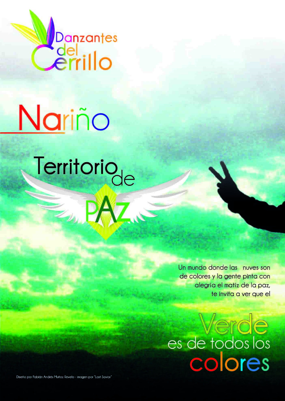 Cartel temático para el conocimiento el departamento de nariño desde una perspectiva de Paz y armonía, puede decirse que el filtro utilizado de extremo contraste da a entender la particular escena de las nubes verdes Ipialeñas junto al signo de la paz universal en lenguaje corporal.