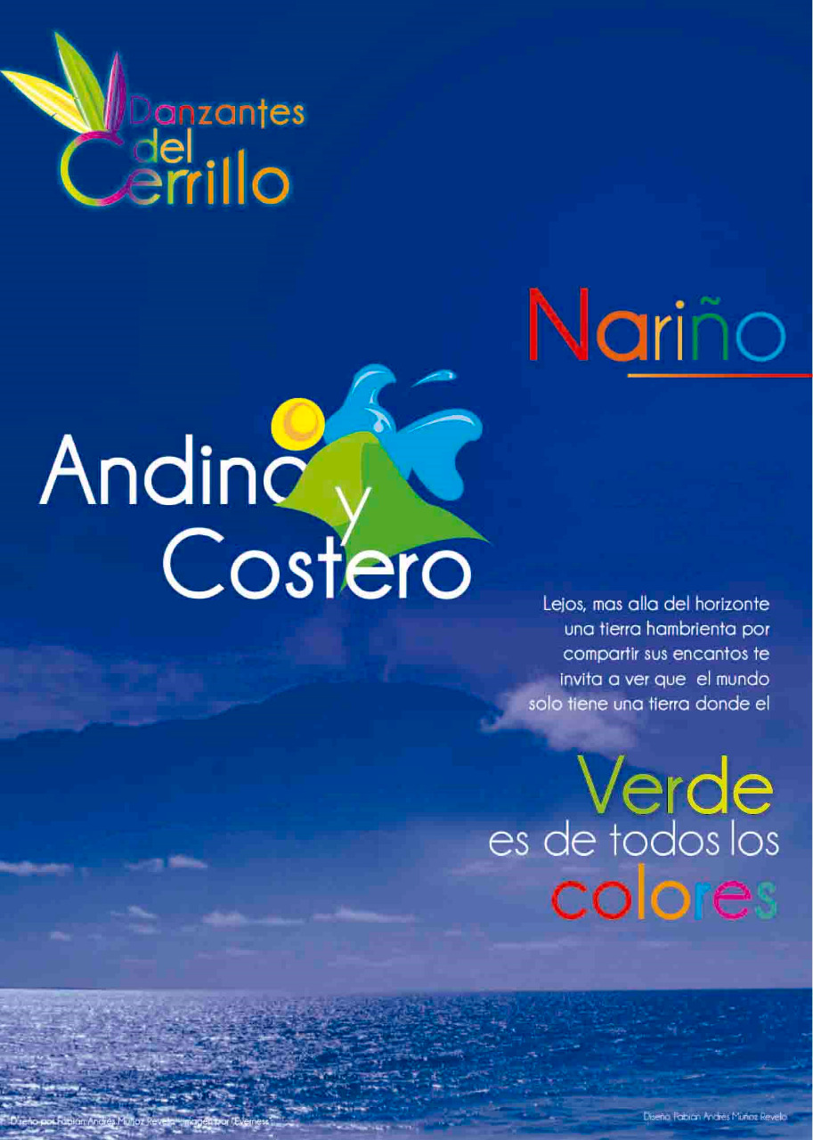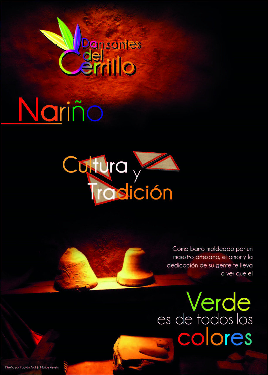Para el proceso gráfico del colectivo Danzantes Del Cerrillo se ha elaborado dos pancartasinformativas generales donde se vea reflejado directa y no muy agresivamente la autenticidad de la cultura nariñense, para eso se ha elaborado cada pieza con una temática distinta en imagen junto al manejo de compocisión, los símbolos gráficos son los mismos adaptados a gerarquía.