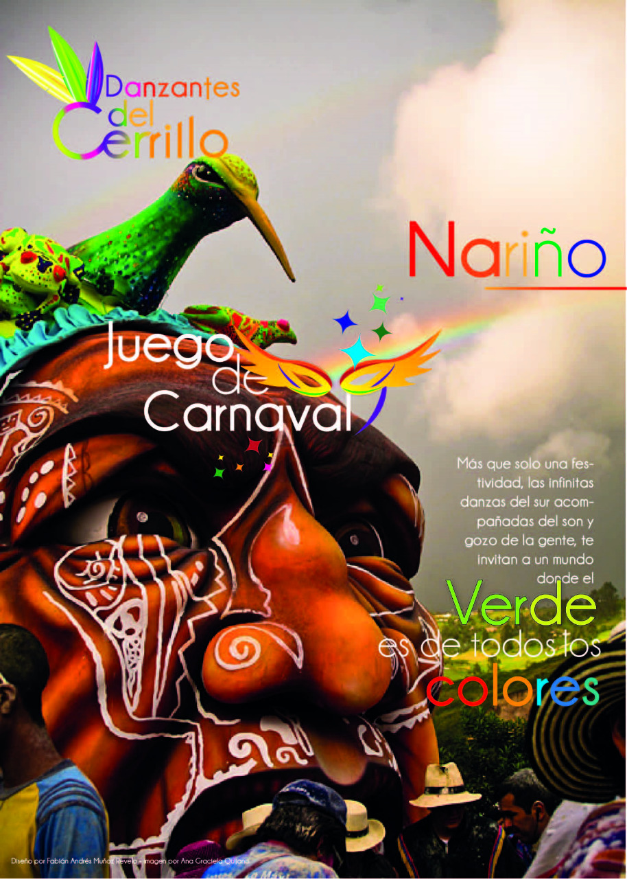 Cartel publicitario para promover la visita y vinculación hacia la música y las tradiciones recreativas nariñenses dotadas de un alto contenido de alegría y color junto a la fascinación por los colores y el carnaval. La fotografía muestra a un grupo de danzantes luego de una presentación de bambuco siendo el contraste entre colores y el fondo oscuro una perfecta tela de compocisión de dos dimensiones.