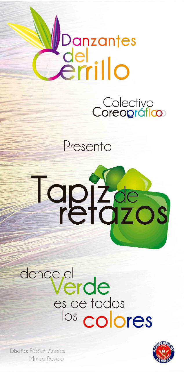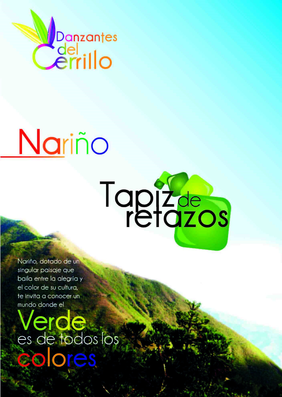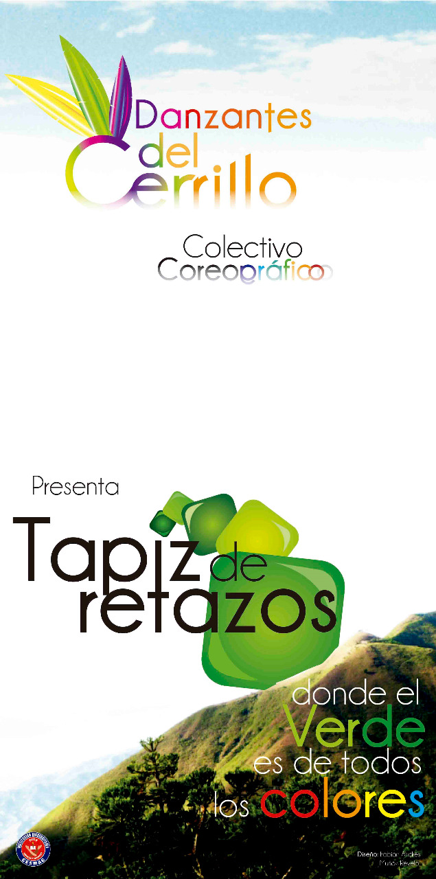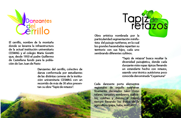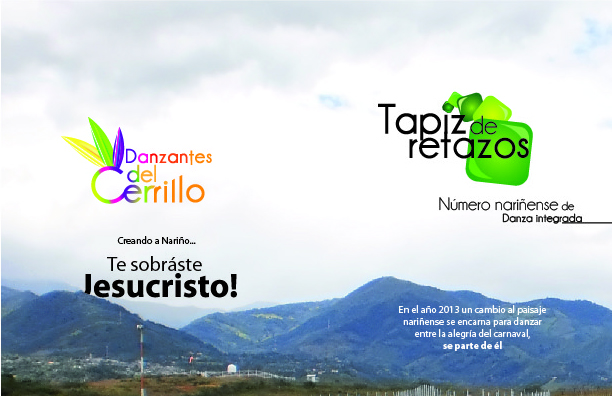 Como siguiente pieza publicitaria para el colectivo de danza Danzantes del Cerrillo tenemos un flyer informativo de dos cuerpos estilo folleto con una estética integrada al paisaje montañoso nariñense al igual que la descripción de la obra "Tapíz de retazos" la cual será exhibida durante la temporada de carnavales del 3 al 7 de enero del año 2013, en esta pieza se introduce al lector en el proyecto del colectivo junto a una descripción textual detallada del mismo en cuanto a vestuario y concepto general.
