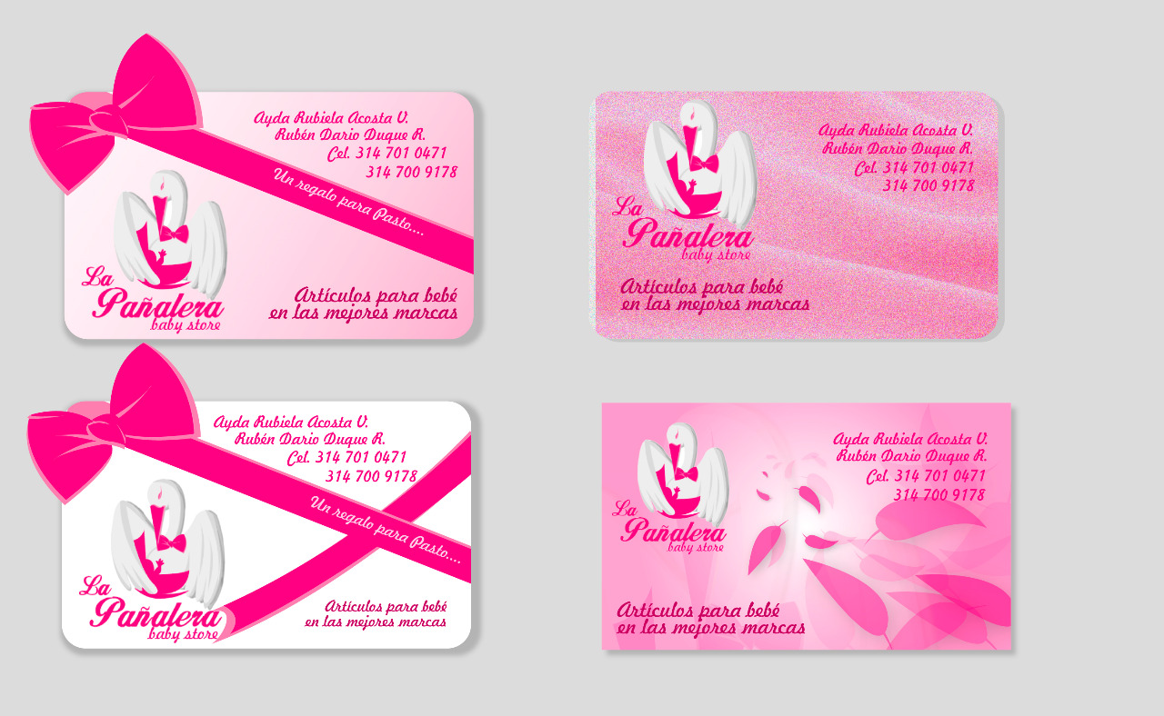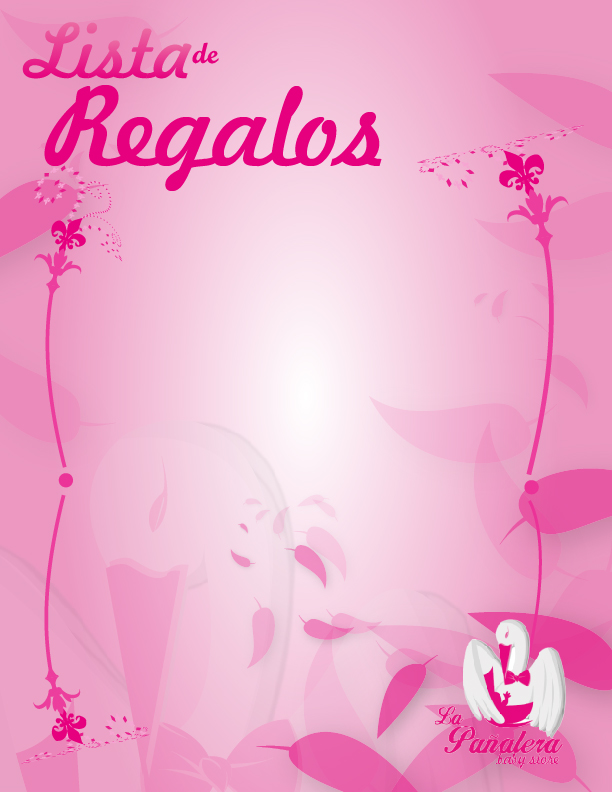Pasando al siguente trabajo de papelería se encuentran las propuestas de tarjetas de presentación para el almacén de ropa para bebé "La pañalera" tomando como eje gráfico la caída de las plumas blancas de la sigueña, la ternura y el regalo de una nueva vida a un hogar. Dentro de las listas de ragalos encontramos una para niño y otra para niña, los colores rosa y cian definen el género, todo acompañado con un aire de bondad y ternura materna.