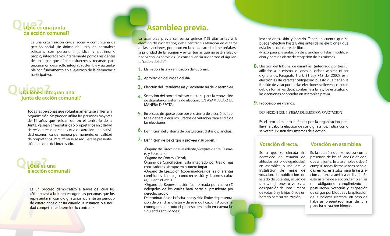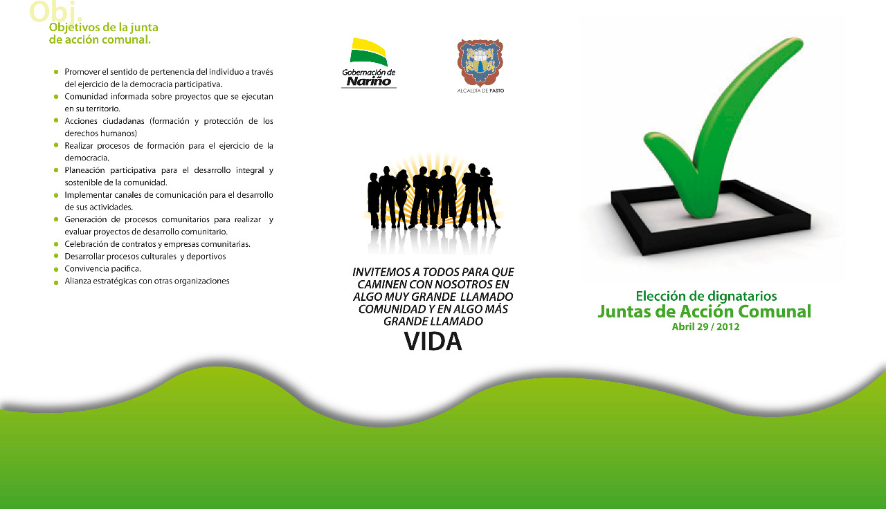 Plegable de tres cuerpos diseñado para juntas de acción comunal nariñenses su objetivo es dar a conocer los procedimientos electorales y la metodología para apoyar a las juntas en su elección, la cromñatica mostrada se deriva del concepto de la ezperanza y la limpieza ante todo obstaculo, usa imágenes sobrias y gran cantidad de elementos que ayudan en la compocisión general de la misma.