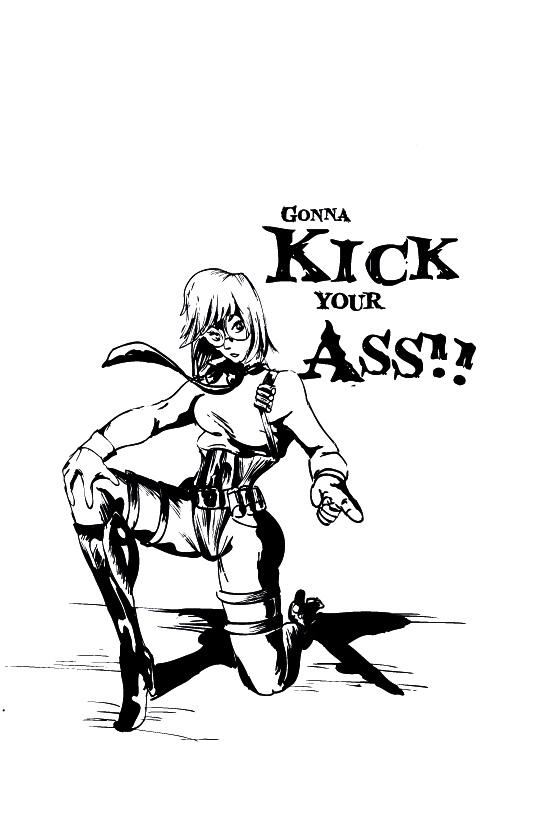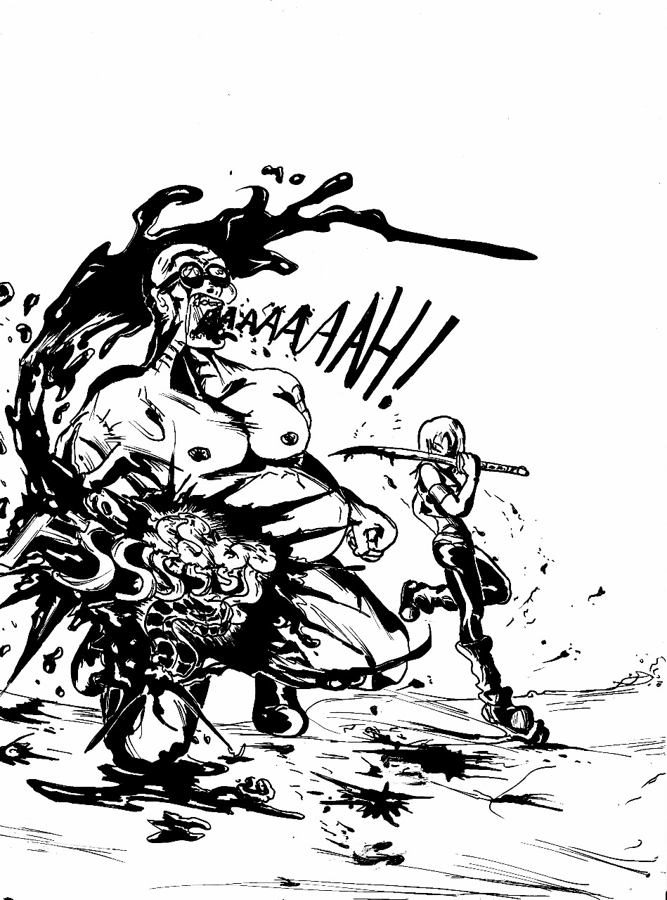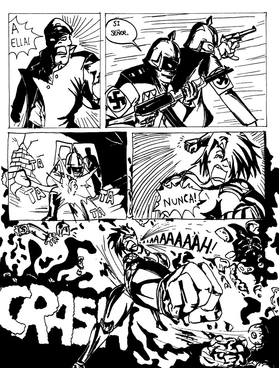 6. Página de muestra publicada en mayo del 2011 en "Diario del Sur" (periódico regional) donde el personaje Pasha D'Salvo peles contra un pequeño grupo de Nazis quienes estaban buscándola para regresarla al laboratorio ( el texto ha sido escrito a mano como boceto no oficial del manga).