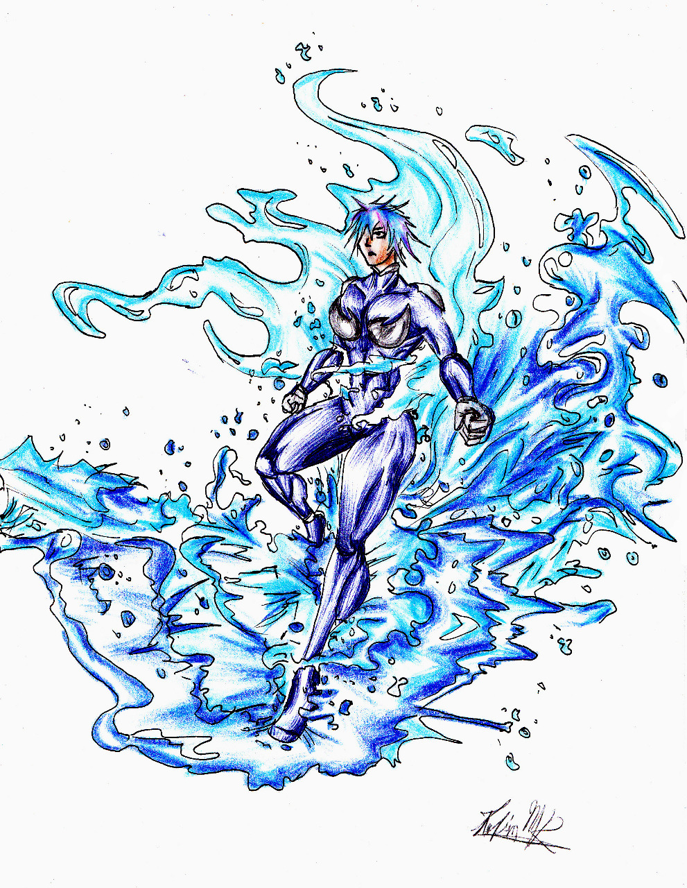 4. Ilustración a lapiz de color y pluma azul y negra Pasha D'Salvo mostrando la dinámica del agua dentro de un contexto cromático holístico sin ligadura a la trama sobre papael bond 72gr.
