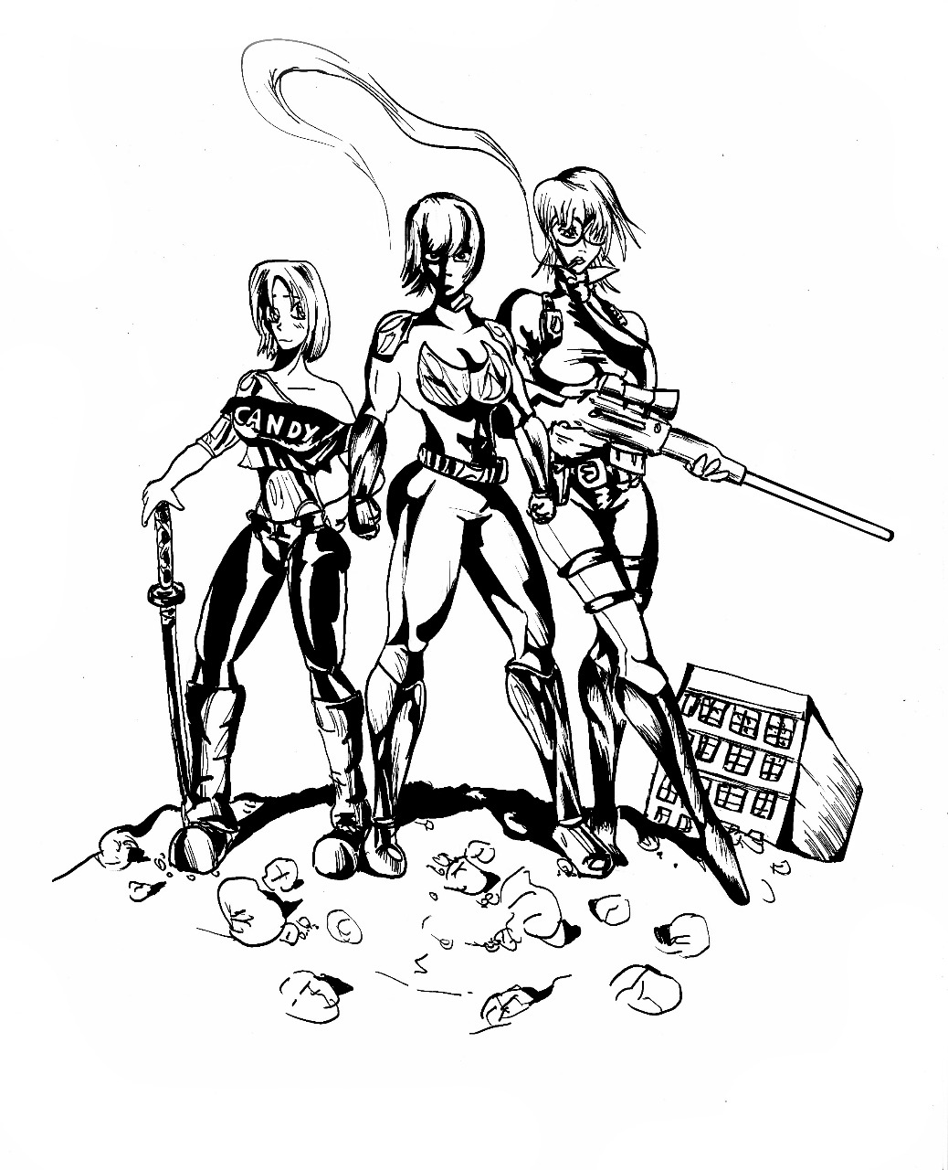 5. Plano general de los tres personajes principales del manga New Treblinka, Pasha D'Salvo (centro), Mina Mc.Guire (derecha) y Ayumi suyusama (izquierda) en una simplificación formal de la ciudad de New Treblinka, técnica blanco y negro con tinta china.