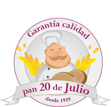 Propuesta de logotipo para la empresa "Panadería 20 de Julio" retrata la garantía y el servicio generoso en la forma de un gentíl y agradecido panadero con un grna y fresco pan en sus manos, tipografía aplicada al tradicionalismo junto a un toque de modernismo minimalista.